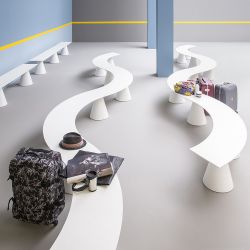 The legs have a base diameter of 31.5 cm, whereas the seat has a depth of 38 cm. The bench, 47 cm high, is available in two forms, combinable together to create different sequences: