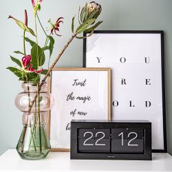 This clock has a modern and minimalist design and is perfect to keep on your bedside table or desk. The movement of the rotating numbers gives it a retro touch that fits well with the clean and essential lines of the case.
