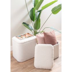 Practical, modern and refined this set of two poufs is covered in white bouclé fabric. Perfect as a pouf in the living room, entrance or bedroom but also as a coffee table.