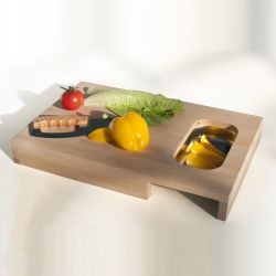 This cutting bord has an important extra feature: a lateral container inside the board where food can be collected as it is chopped, thus leaving the surface free. The container is in stainless steel and can be easily removed and used to hold food.