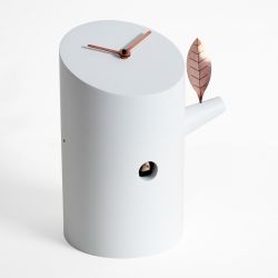 Three simple elements make Nido a modern cuckoo clock: a clipped cylinder with slanting section to represent a trunk, a small branch and a copper leaf.