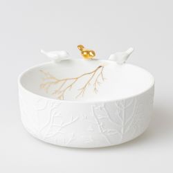 Village bowl is a serving dish or a large bowl in opaque white glazed porcelain with a stylised internal decoration of a snowy village.