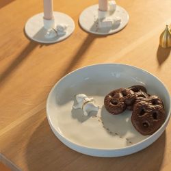 Made of white porcelain and embellished with delicate gold details, it is available in two sizes, each with a unique representation of Santa Claus.
