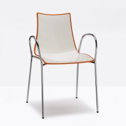 This modern chair with armrests has a chromed or varnished tubular steel frame with 16 mm diameter section. Backrest and seat are made of two-coloured polymer: the outer side has a faceted polished surface available in several colours while the inner polished side is white.