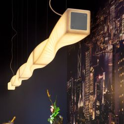 The particular shape of the Spin lamp is obtained from a twisted square-based parallelepiped. By assembling the individual modules together, customized compositions can be created. Ideal for contract interior design and more.