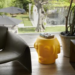 This coffee table for living room or garden has an ironic and contemporary design. The base has three ethnic-style faces revisited in a pop key that evoke an evolution of the ancient rituals of sharing space and time.