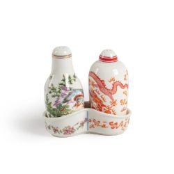The set consists of two ceramic salt and pepper shakers, decorated with different motifs: one with red dragons and details inspired by Eastern iconography, the other with naturalistic and floral scenes typical of Western tradition.