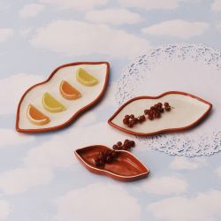 Made of glazed ceramic , this set of plates with soft, sinuous lines stands out for its unmistakable shape: red lips that add a touch of sensuality and irony to the table.
