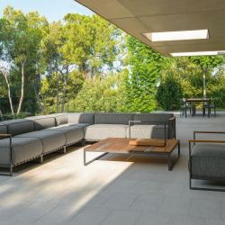 The Casilda coffee table has a metal frame, powder-coated, whereas the tabletop is made of Accoya wood with iroko finish and inserts in travertine. All these materials are durable and thus suitable for outdoor use, since they are resistant to weather, humidity and saltiness.