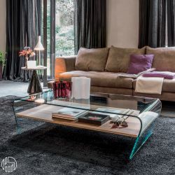 This coffee table is made of extra-clear transparent or transparent smoked grey.