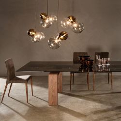 Above it rests a rectangular top available in glass, glass-ceramic or stoneware , offered in both a fixed and extendable version (on request), to adapt with versatility to every space and functionality requirement.