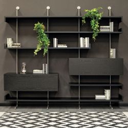 This modular bookcase by Tonin Casa is designed to be fixed to the wall or ceiling and stands out for its solid and minimal painted steel structure.