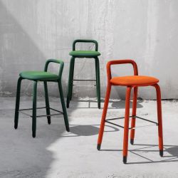 Pippi combines sinuous shapes, quality materials, and vibrant colors. Made with a four-legged fabric-covered frame and exposed metal feet.
