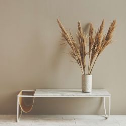 La estructura de la mesa de centro es de acero pintado, mientras que la tapa es de mármol o piedra. El bolsillo para revistas es de piel y es extraíble.