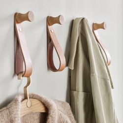 Esta serie de percheros de pared tiene un diseño simple pero sofisticado. El pomo de madera de roble está equipado con un anillo de cuero en el que puedes colgar bufandas, paraguas y perchas para la ropa.