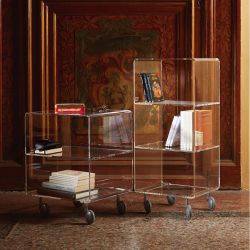Andy es un carro polivalente con ruedas en metacrilato transparente; las llantas son de aluminio inyectado en acabado gris.