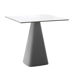 Mesa de diseño perfecta para decorar la zona de comedor de la terraza o el exterior de bares y restaurantes. Su forma es sencilla y moderna: una pirámide troncocónica de aristas redondeadas sobre la que se apoya la fina tapa.