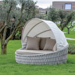 La estructura de aluminio está decorada con un tejido de textilene y cuerda de caucho y un colchón recubierto de tejido repelente al agua.