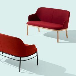 El sofá de dos plazas Agami está fabricado en madera de haya teñida certificada FSC y el asiento tapizado y tapizado en una amplia gama de tejidos.