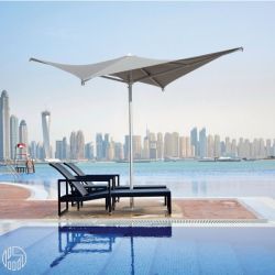 La forma de este paraguas es cuadrada, pero con las esquinas a dos alturas diferentes, para obtener el efecto dinámico de la cubierta.