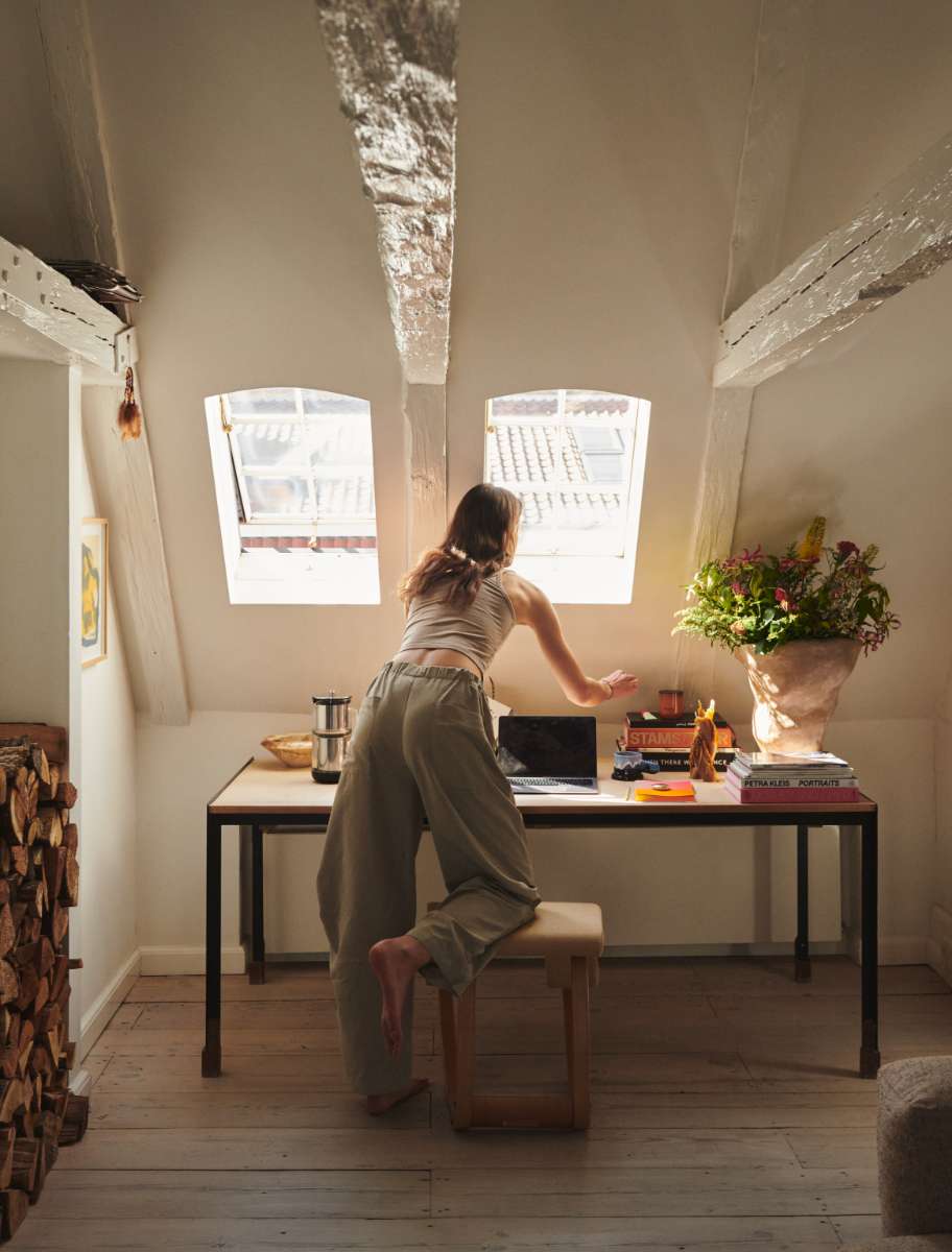 Incluso en casa, el movimiento puede convertirse en parte integral del bienestar diario. Un ejemplo es Amalie Reedtz-Thott, quien ha optado por un estilo de vida más tranquilo y consciente, viviendo en un retiro en el corazón de Copenhague. Para ella, el bienestar significa sentirse en casa con su cuerpo: escuchando sus ritmos, prestando atención a la nutrición, el movimiento y las emociones. Su casa también se ha convertido en su estudio, un espacio multifuncional donde cada elemento contribuye a crear equilibrio.
