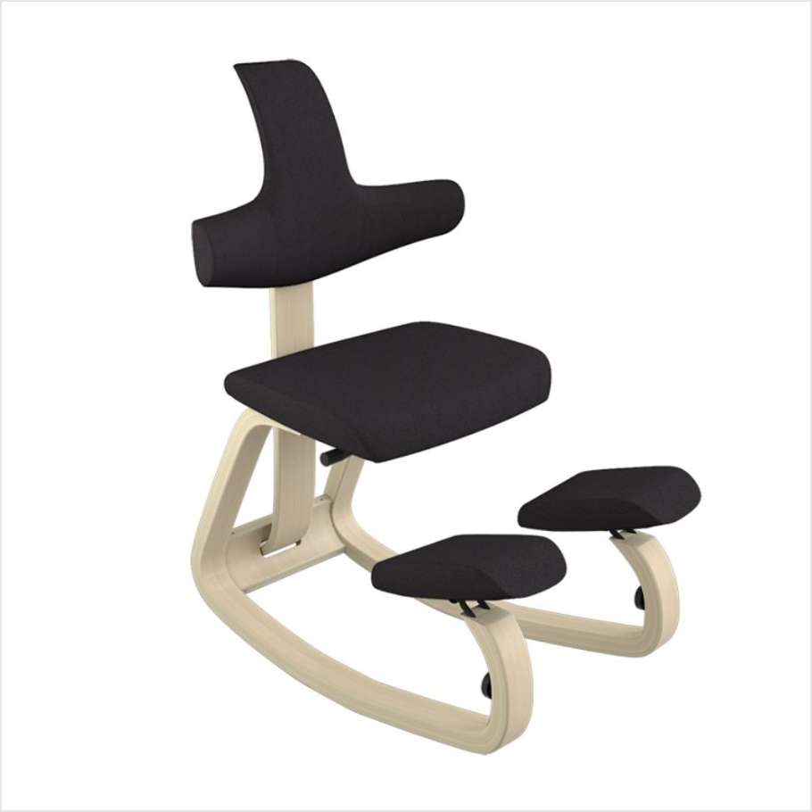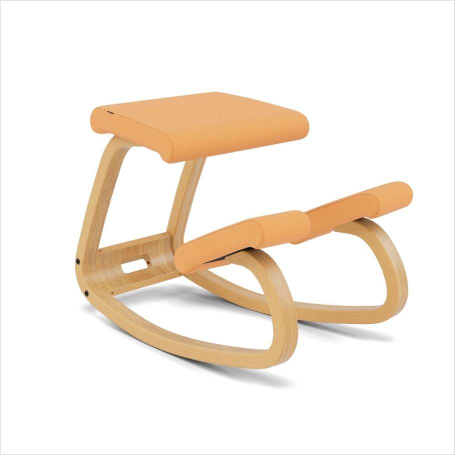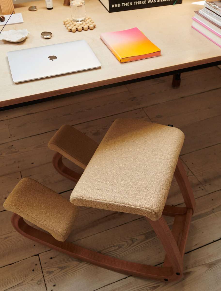 Las sillas ergonómicas con apoyo para las rodillas de Varier están diseñadas según un principio bastante sencillo. En una silla normal, las piernas suelen estar en ángulo recto con el tronco, una posición que a menudo lleva a que el peso del cuerpo se coloque sobre la columna. El asiento inclinado hacia adelante y el soporte para las rodillas de las sillas Varier permiten ampliar el ángulo y aliviar el peso de las piernas. La espalda adopta así una posición natural y erguida.