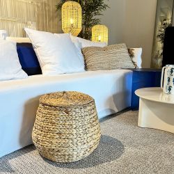 Fabricada en yute y equipada con tapa y asa, permite guardar ropa de cama y accesorios, manteniendo el orden en el hogar.