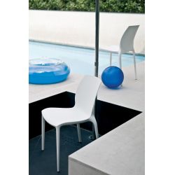 Silla apilable con estructura integral en polipropileno y fibra de vidrio. Su forma sinuosa y curvilínea se ve acentuada por la continuidad del material.