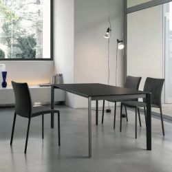 Silla moderna totalmente acolchada y revestida con estructura de acero . La forma de la silla es muy sencilla, por lo que es perfecta para salón y cocina. El asiento es especialmente profundo y cómodo gracias al perfil ligeramente curvado.