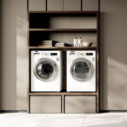En esta solución de lavandería, el mueble está compuesto por un mueble de almacenaje con dos compartimentos abiertos y dos cajones dotados de ruedas.
