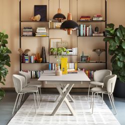 La mesa tiene una estética moderna , gracias a una sólida estructura de metal compuesta por cuatro patas dispuestas en pares cruzados, formando dos sólidas estructuras en forma de X.