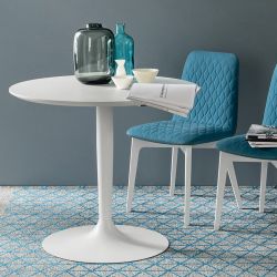 Mesa moderna y elegante caracterizada por una base central de metal, disponible en cromo, negro o blanco óptico opaco.