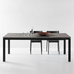 La estructura es de metal pintado con acabado mate o satinado. La tapa rectangular está disponible en varios materiales; La combinación entre top y extensión es la siguiente: