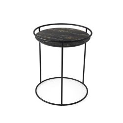 Atollo es una mesa de centro con un diseño minimalista y proporcionado, perfecta para completar los muebles de la sala de estar. La estructura está realizada en varilla de metal pintado, mientras que la tapa es acoplada cerámica-madera, con acabado mármol.