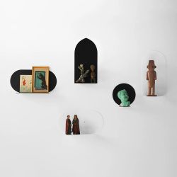 AUREOLE es una colección de cinco estantes de acero pintado que transforman las paredes en espacios expositivos personales, como en un museo.