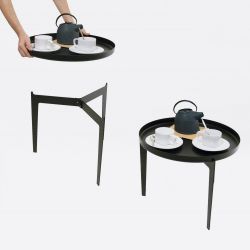 Una mesa de centro de diseño, pero no solo. De hecho, la parte superior redonda se puede quitar fácilmente de la base de tres patas y convertirse en una bandeja funcional.
