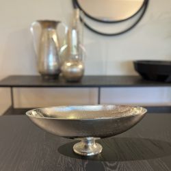 Cuenco decorativo de metal con acabado plata brillante y efecto ligeramente martillado , diseñado para añadir un toque de elegancia a cualquier ambiente.