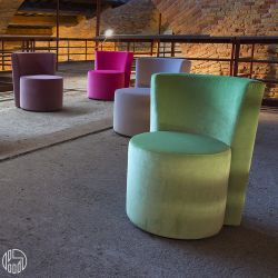 Este modelo tiene unas dimensiones reducidas y una línea muy sencilla y compacta; está formado por un cilindro envuelto menos de la mitad por el respaldo, que sigue su diámetro. Sin reposabrazos, es cómodo y práctico, apto para múltiples usos.