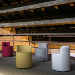 Percy es un sillón pequeño con una huella pequeña. Su forma está dada por un simple cilindro envuelto parcialmente por una superficie curva que actúa como respaldo.