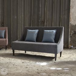 Sofá moderno con sabor retro. El diseño es simple, con volúmenes cuadrados, suavizado por la curva de los reposabrazos que conectan el respaldo y el asiento.