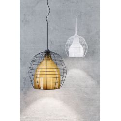 El diseño de esta lámpara colgante está inspirado en las luces de las jaulas metálicas que utilizaban los mineros y trabajadores, de las que toma su nombre. Reinterpretada en clave moderna, la jaula de metal se convierte en la estructura de esta lámpara, que encierra un elegante difusor de vidrio soplado y crea un efecto sorprendente con su forma ligeramente irregular.