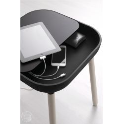 Tanto la forma cuadrada con ángulos redondeados como el mismo nombre de esta mesita, App, son una referencia al mundo de los smartphones y de las aplicaciones. Gracias al pasacables escondido, App-S no sólo es la clásica mesita para combinar al sofá, pero se convierte también en una superficie de apoyo muy útil para lámparas y dispositivos tecnológicos, como por ejemplo el celular.