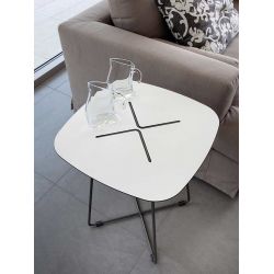 La estructura de Cross, realizada en varilla metálica barnizada de colores, se aprecia no sólo en la clásica base sino también en la tapa de la mesita, realizada en HPL con ángulos suaves y redondeados al nivel de la cruz del armazón. La estructura se convierte, entonces, en un elemento funcional y estilístico.