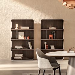 Icónica y distintiva, la estantería Academy cuenta con un marco de hierro, estantes de roble macizo, dos divisores de vidrio y un respaldo de madera o tapizado en una variedad de telas.