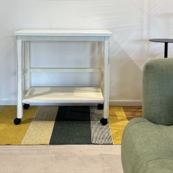 Carro de servicio de cocina fabricado en madera de haya, con dos estantes en melamina color blanco envejecido.