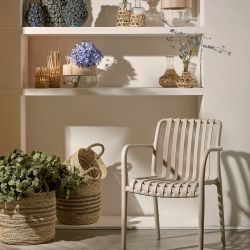 Presentado en diferentes colores con acabado mate, está fabricado en polipropileno. El respaldo y el asiento son de listones. Los reposabrazos completan el diseño del sillón haciéndolo más cómodo.
