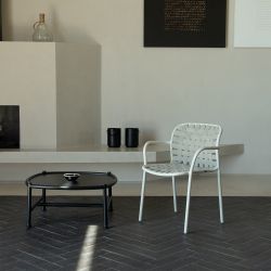 Ideal tanto para decoración interior como exterior, la silla Yard tiene un marco de aluminio pintado, mientras que el asiento y el respaldo están hechos con una combinación de correas elásticas.