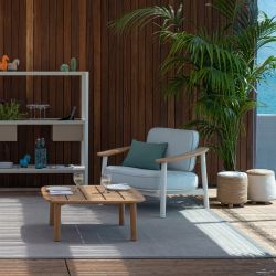 El sillón Twins, al igual que los sofás de la misma colección, se fabrica en versión doble: con estructura de aluminio pintado y brazos de teca , o con estructura íntegramente de madera .