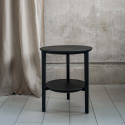 Esta mesa de centro, fabricada íntegramente en roble macizo, es apta tanto para ambientes de estilo rústico como moderno. La mesa de centro consta de tres patas y dos estantes macizos.