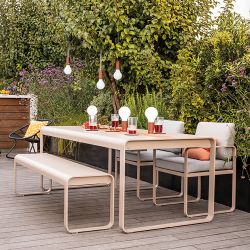 La colección Bellevie tiene un diseño contemporáneo, perfecto para amueblar los espacios exteriores de la casa, como la terraza o el jardín, o zonas exteriores. Fabricada en aluminio pintado, ligera y resistente, esta línea de sillas , taburetes, bancos y mesas de exterior es resistente a los agentes atmosféricos y a los rayos UV.